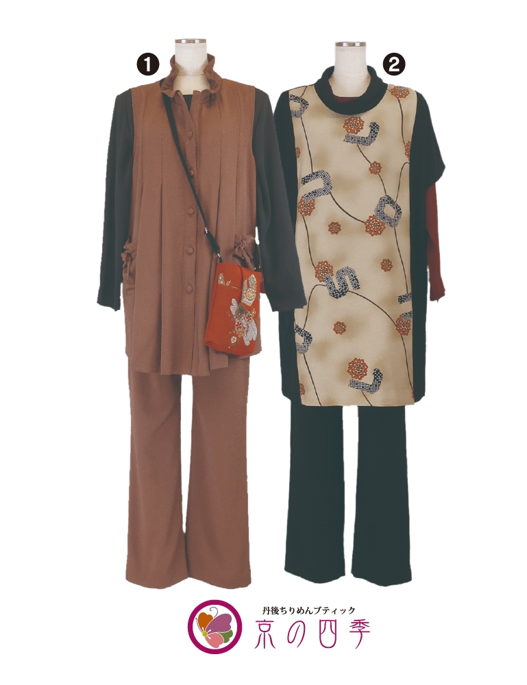 ■10月15日(水)〜28日(火) 体型をカバーしてくれるデザイン。ご旅行などに最適です。 ❶ちりめんベスト 17,600円 ちりめんパンツ 16,500円 ❷ちりめん チュニックブラウス 25,300円 ちりめんパンツ 16,500円 ■7階 京の四季