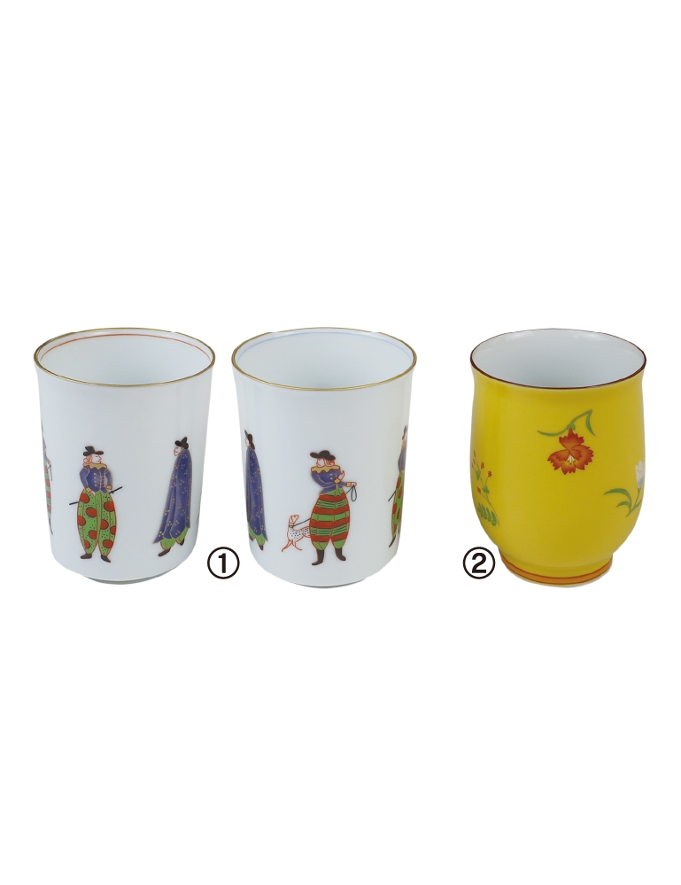 ■11月5日(水)から 波佐見焼「しのぎ」シリーズ ●特大皿 3,311円 ●大皿 1,540円 ●小皿 654円 ●小付 693円 〈香蘭社〉 ①組湯呑和蘭陀人 3,080円 ②湯呑黄釉小花 3,344円 ■8階 各ショップ