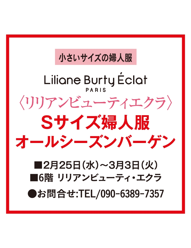 ■2月25日(水)〜3月3日(火) 小さいサイズの婦人服 〈リリアンビューティエクラ〉 期間限定でお気に入りのアイテムを見つけてください。 [お問合せ]TEL/090-6389-7357 ■6階 リリアンビューティ・エクラ