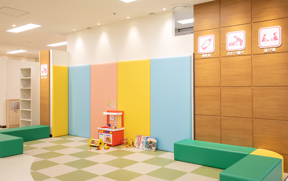 施錠できる授乳室、ベビーシート(おむつ替え)、ポット(ミルク用)、自動販売機(おむつも販売)を完備したベビー休憩室です。また、靴を脱いで遊べるコーナー、おもちゃや絵本もご用意しており、お子様に自由に遊んでいただけます。